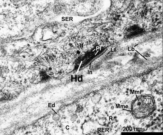 半桥粒(hemidesmosome)在结构上类似桥粒,位于上皮细胞基面与基膜之间(图11-9),它桥粒的不同之处在于:①只在质膜内侧形成桥粒斑结构,其另一侧为基膜;②穿膜连接蛋白为整合素(integrin)而不是钙粘素,整合素是细胞外基质的受体蛋白;③细胞内的附着蛋白为角蛋白(keratin)。
