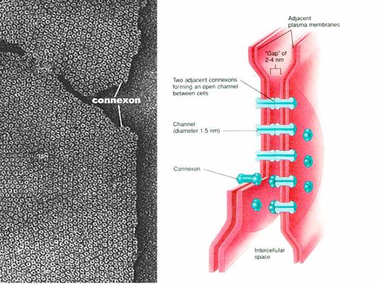 左,连接子电镜照片;右,间隙连接模型
