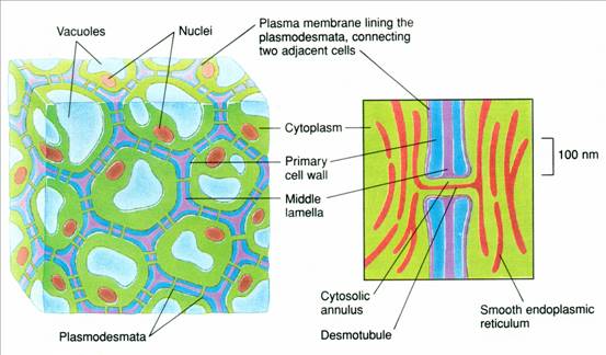 胞间连丝(plasmodesmata)是植物细胞特有的通讯连接。是由穿过细胞壁的质膜围成的细胞质通道,直径约20~40nm。因此植物体细胞可看作是一个巨大的合胞体(syncytium)。通道中有一由膜围成的筒状结构,称为连丝小管(desmotubule)。连丝小管由光面内质网特化而成,管的两端与内质网相连。连丝小管与胞间连丝的质膜内衬之间,填充有一圈细胞质溶质(cytosol)。一些小分子可通过细胞质溶质环在相邻细胞间传递(图11-12)。
