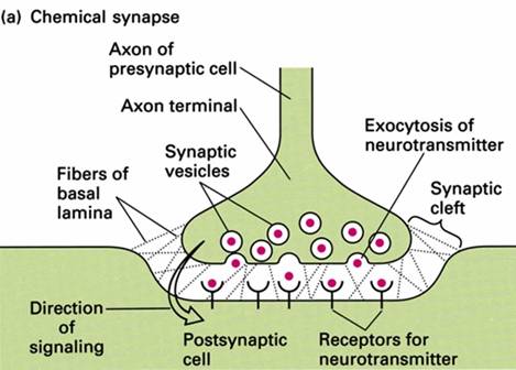 突触小体内有许多囊泡,称突触小泡(synaptic vesicle),内含神经递质。当神经冲动传到突触前膜,突触小泡释放神经递质,为突触后膜的受体接受(配体门通道),引起突触后膜离子通透性改变,膜去极化或超极化。
