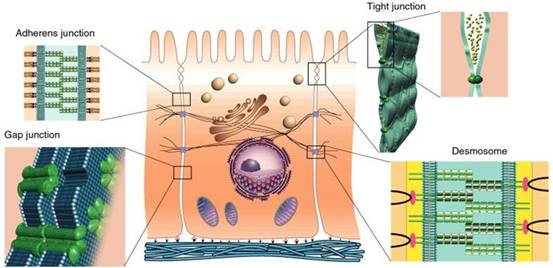 紧密连接的焊接线由跨膜细胞粘附分子构成,主要的跨膜蛋白为claudin和occludin,另外还有膜的外周蛋白ZO。