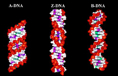 三种不同构象的DNA双螺旋
