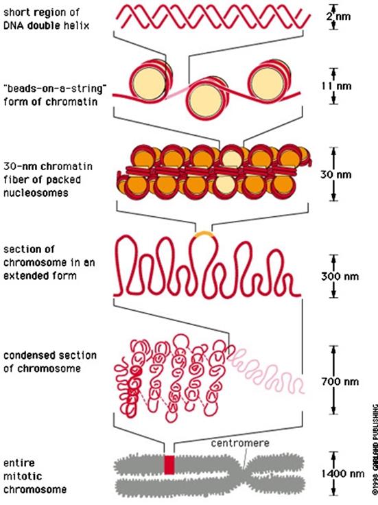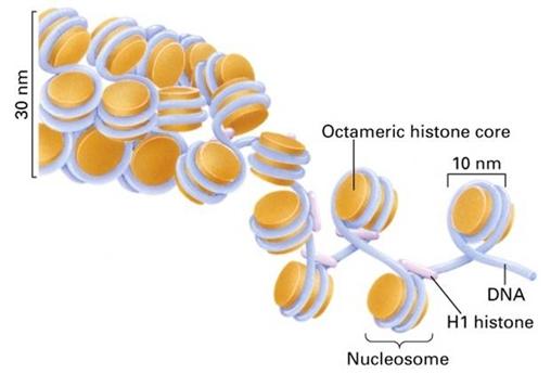 人体的一个细胞核中有23对染色体,每条染色体的DNA双螺旋若伸展开,平均长为5cm,核内全部DNA连结起来约1.7-2.0m,而细胞核直径不足10um。因此,不难想象DNA是以螺旋和折叠的方式压缩起来的,压缩比例高达上万倍,这种压缩的最初级结构就是核小体。