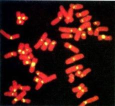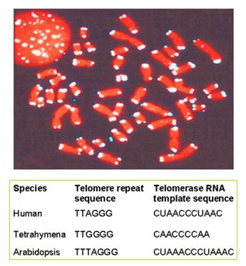 图12-19 荧光原位杂交显示的端粒(上)和端粒序列(下)