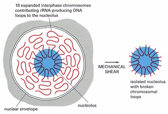 6.核仁组织区(nucleolar organizing regions, NORs):是核糖体RNA基因所在的区域(图12-18),其精细结构呈灯刷状。能够合成核糖体的28S、18S和5.8S rRNA。核仁组织区位于染色体的次缢痕区,但并非所有的次缢痕都是NORs。