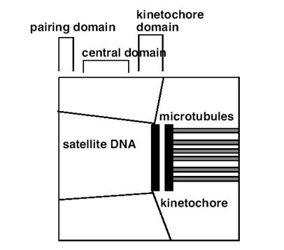 着丝粒含3个结构域(图12-20),即:着丝点结构域(kinetochore domain)、中心结构域(central domain)和配对结构域(paring domain)。