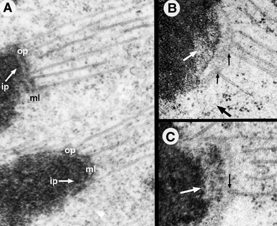 着丝点结构域(图12-21):位于着丝粒的表面,由外板(outer plate)、内板(inner plate)、中间区(interzone)和围绕外层的纤维冠(fibrous corona)。内外板的电子密度高,中间区电子密度低。内板与中央结构域的着丝粒异染色质结合,外板与微管纤维结合,纤维冠上结合有马达蛋白,如胞质Dynein和属于kinesin家族的CENP-E,为染色体的分离提供动力。