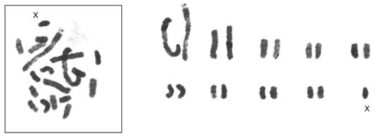 核型(karyotype)是细胞分裂中期染色体特征的总和,包括染色体的数目、大小和形态特征等方面。如果将成对的染色体按形状、大小依顺序排列起来叫核型图(karyogram, 图12-22),而染色体组型idiogram通常指核型的模式图,代表一个物种的模式特征。