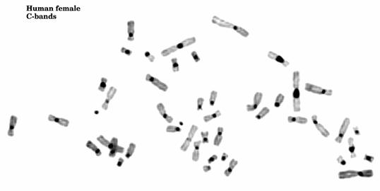 人类C带核型,C带显示的是着丝粒异染色质