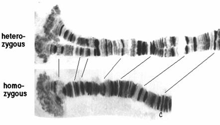 1881年意大利的Balbiani发现于双翅目摇蚊幼虫的唾腺细胞。其特点是:①体积巨大(图12-26),比其它体细胞染色体长100-200倍,体积大1000-2000倍,这是由于核内有丝分裂的结果,即染色体多次复制而不分离。②多线性,每条多线染色体由500-4000条解旋的染色体合并在一起形成。③体细胞联会,同源染色体紧密配对,并合并成一个染色体。④横带纹,染色后呈现出明暗相间的带纹。⑤膨突和环,在幼虫发育的某个阶段,多线染色体的某些带区疏松膨大,形成膨突(puff),或巴氏环(Balbiani ring)。用H3-TdR处理细胞,发现膨突被标记,说明膨突是基因活跃转录的形态学标志。