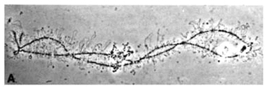 这种染色体最早发现于鱼类、两栖类和爬行类卵母细胞减数分裂的双线期。双线期是卵黄合成的旺盛期。由于染色体主轴两侧有侧环,状如灯刷,故名灯刷染色体(图12-27)。由两条同源染色体组成,在交叉处结合,每条同源染色体含2条染色单体。轴上有一些染色粒,代表染色质紧密螺旋化的部位。同时两条染色单体向两边伸出许多侧环,侧环是RNA活跃转录的区域。