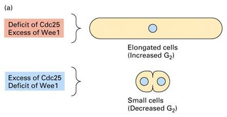 Cdc25表达不足,细胞长得过长而不分裂;Wee1表达不足,细胞很小就开始分裂了