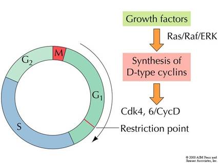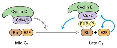 细胞在生长因子的刺激下,G1期cyclin D表达,并与CDK4、CDK6结合,使下游的蛋白质如Rb磷酸化,磷酸化的Rb释放出转录因子E2F,促进许多基因的转录,如编码cyclinE、A和CDK1的基因。