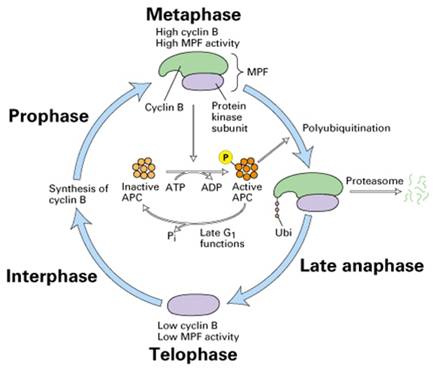在中期当MPF活性达到最高时,通过一种未知的途径,激活后期促进因子APC,将泛素连接在cyclinB上,导致cyclinB被蛋白酶体(proteasome)降解,完成一个细胞周期(图13-24)。