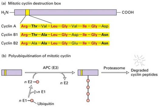 分裂期周期蛋白N端有一段序列与其降解有关,称降解盒(destruction box,图13-25)。当MPF活性达到最高时,通过泛素连接酶催化泛素与cyclin结合,cyclin随之被26S蛋白酶体水解。G1周期蛋白也通过类似的途径降解,但其N端没有降解盒,C端有一段PEST序列与其降解有关。