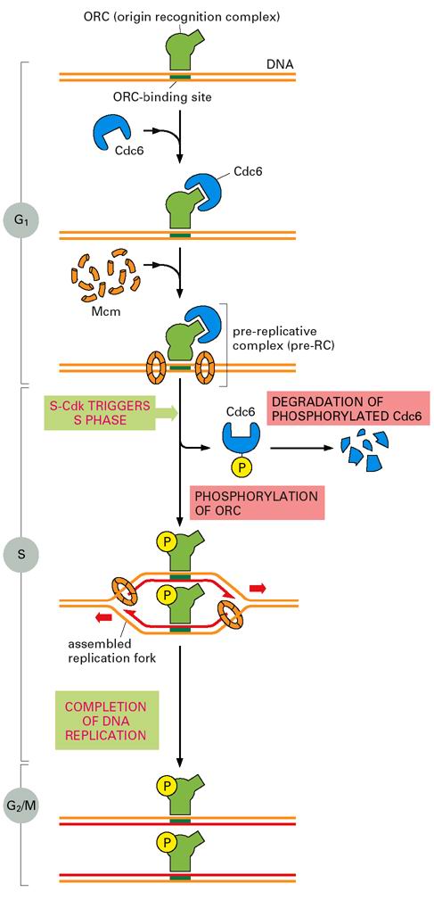 CDC6是其中的一个调节因子,在G1期CDC6含量瞬间提高,CDC6结合在ORC上,在ATP供能下,促进6个亚单位构成的MCM复合体和其他一些蛋白结合到ORC上,形成前复制复合体(pre-replicative complex,pre-RC),MCM实际上就是DNA解旋酶(helicase)。