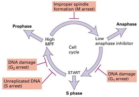 细胞要分裂,必须正确复制DNA和达到一定的体积,在获得足够物质支持分裂以前,细胞不可能进行分裂。细胞周期的运行,是在一系列称为检验点(check point)的严格检控下进行的,当DNA发生损伤,复制不完全或纺锤体形成不正常,周期将被阻断。